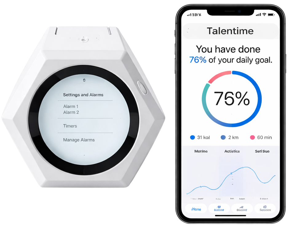Un dispositivo físico inteligente que registra cómo distribuyes tu tiempo mediante interacción natural, sin apps intrusivas ni distracciones digitales.